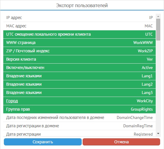 MyChat дает возможность сохранить в виде CSV файла любые данные о зарегистрированных пользователях. Для этого в списке пользователей отметьте людей, которые вас интересуют и нажмите кнопку "Экспорт". В Диалоговом окне выберите поля, которые вас интересуют и нажмите кнопку "Сохранить".